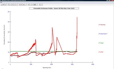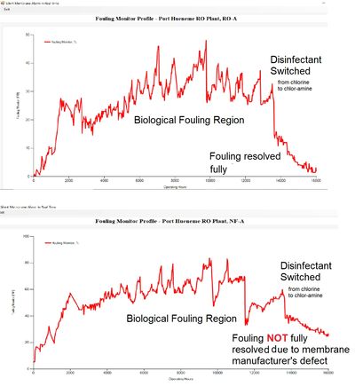Recent performance analysis of over 12,000 data records of operating data covering about 3,500 hours of operation of one pressure vessel with 6 newly-developed membrane elements from a test pilot plant at a major global membrane manufacturer's research site using our proprietary software package, MASAR®'s SilentAlarm, shows the actual performance characteristics summarized in the graph on the left of the measured profile of the Fouling Monitor, with very definitive, very specific and actionable and continuous early fouling detection and monitoring, allowing the operator to decide what steps to take in real time to resolve the impending fouling before too late . The client's technical and research experts stated unambiguously that with this innovative and unique analysis, they have seen something they have never seen before.